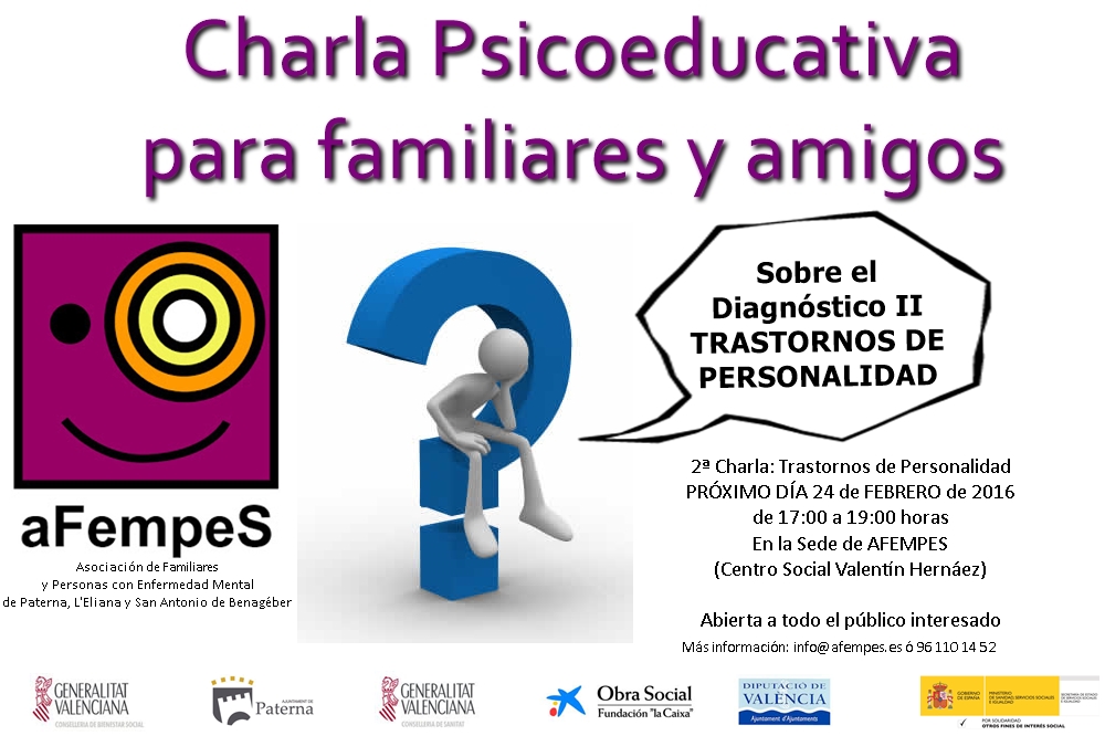 Este próximo miércoles día 24 de Febrero el psicólogo de nuestra Asociación volverá con las Charlas Formativas para Familiares, amigos y todo aquel que esté interesado. En la sesión anterior estuvimos hablando de todo lo relacionado con el diagnóstico de la esquizofrenia: qué es, cuales son sus síntomas, causas, etc,… En esta ocasión, retomaremos y continuaremos hablando de más diagnósticos en enfermedad mental: los trastornos de personalidad, el trastorno bipolar, la depresión mayor, el trastorno límite,…