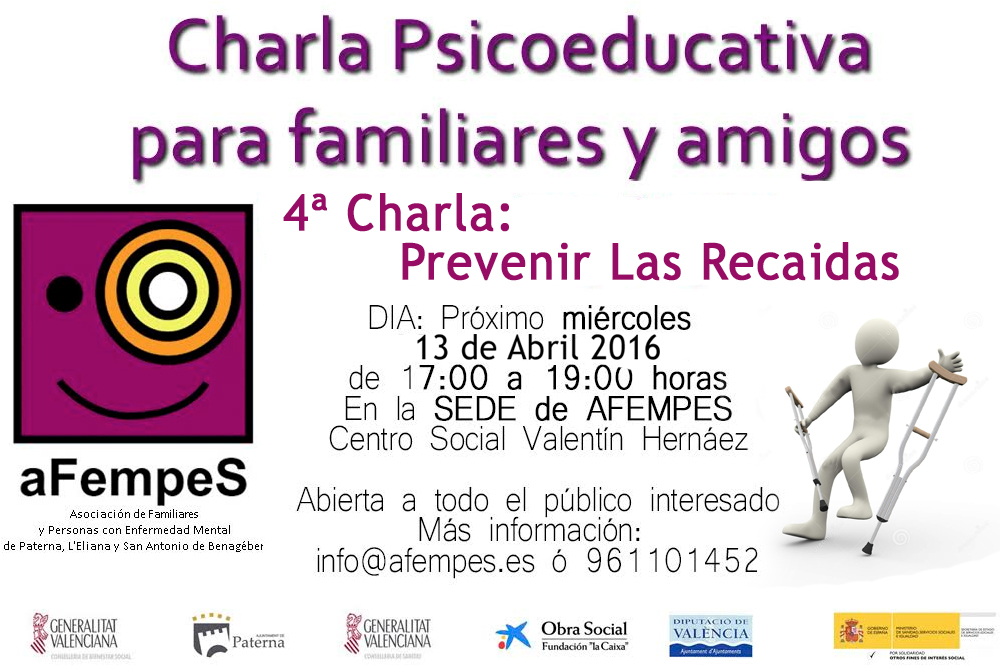 Continuamos con las charlas formativas sobre trastornos mentales. Esta semana el tema «Prevención de recaídas». Insistimos en que se aprovechen estas sesiones para sensibilizarse con el colectivo, desaparezcan prejuicios y el estigma social. Esto es una invitación para todo aquel que quiera y que esté interesado en el tema de los trastornos de la salud mental.