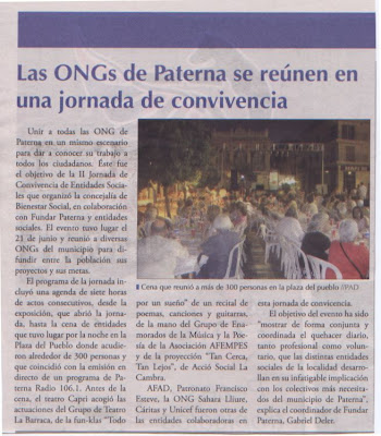 EL PASADO VIERNES 30 DE MAYO SE REUNIÓ EN EL CENTRO POLIVALENTE VALENTÍN HERNÁEZ LA COMISIÓN DE TRABAJO DE ENTIDADES CON EL OBJETIVO DE PREPARAR LA JORNADA DE CONVIVENCIA DEL PRÓXIMO 21 DE JUNIO DE 2008.EN LA REUNIÓN PARTICIPARON UN TOTAL DE 15 PERSONAS, REPRESENTANTES DE 8 ENTIDADES SOCIALES DEL MUNICIPIO, Y DOS TÉCNICOS DEL ÁREA DE BIENESTAR SOCIAL DEL AYUNTAMIENTO DE PATERNA.BAJO EL NOMBRE «II JORNADA DE CONVIVENCIA DE ENTIDADES SOCIALES DE PATERNA», SE PLANTEAN LOS SIGUIENTES OBJETIVOS:1. Favorecer el conocimiento de las entidades sociales del municipio2. Preparar una acción de manera conjunta con el fin de organizarnos y trabajar juntos3. Dar a conocecer el trabajo que las entidades realizanLA JORNADA SE REALIZARÁ EL PRÓXIMO SÁBADO 21 DE JUNIO EN EL TEATRO CAPRI Y EN LA PLAZA DEL PUEBLO, DONDE SE COMBINARÁN REPRESENTACIONES TEATRALES, POESÍA, EXPOSICIÓN DE TRABAJOS, MÚSICA, CENA,…, DESDE LAS 17 HORAS HASTA LAS 24 HORAS APROXIMADAMENTE.SE ESTÁ TRABAJANDO EN LA CONFECCIÓN DEL PROGRAMA, QUE EN BREVE «COLGAREMOS» EN ESTE BLOG.